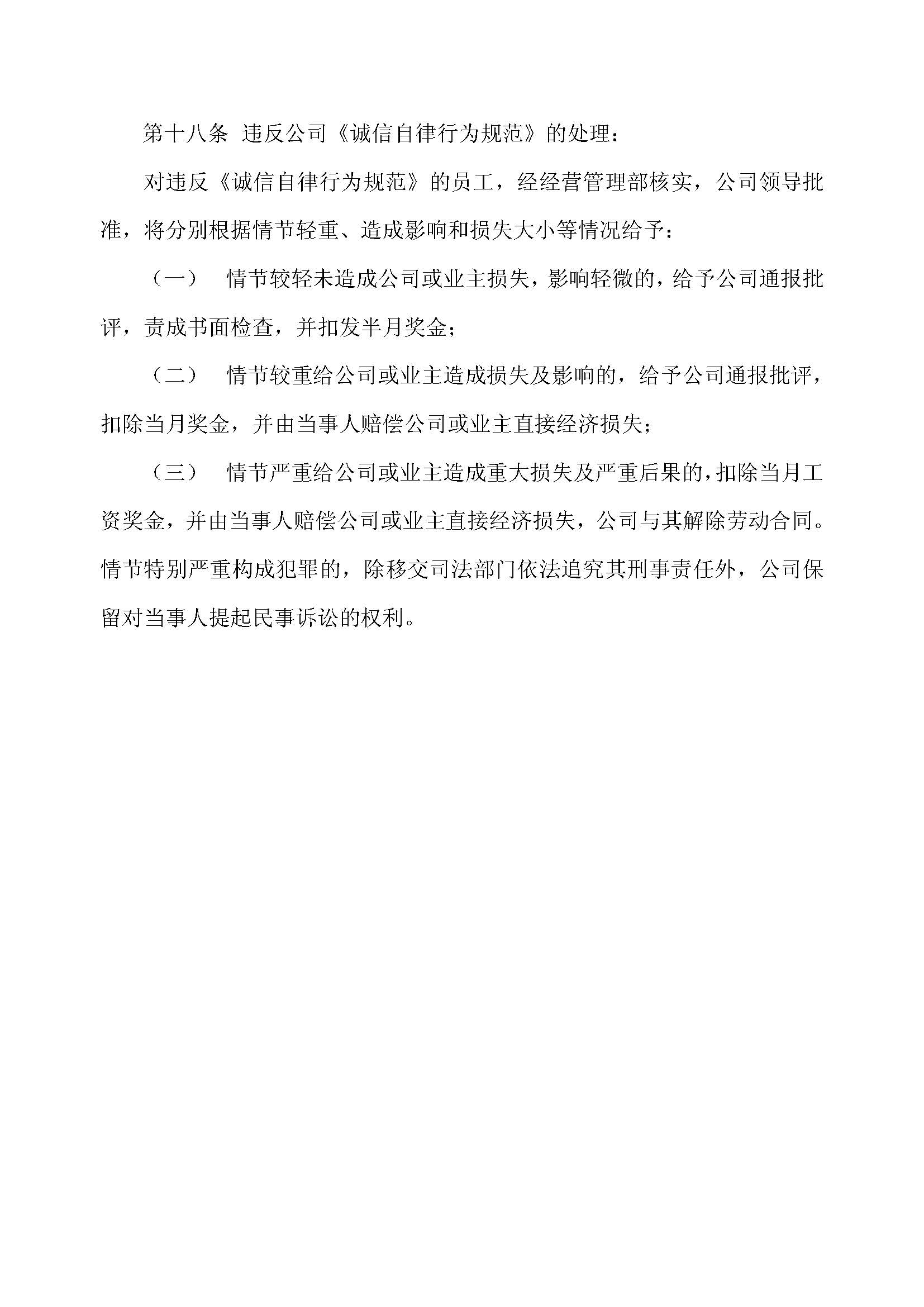 第十八条       违反公司《诚信自律行为规范》的处理: